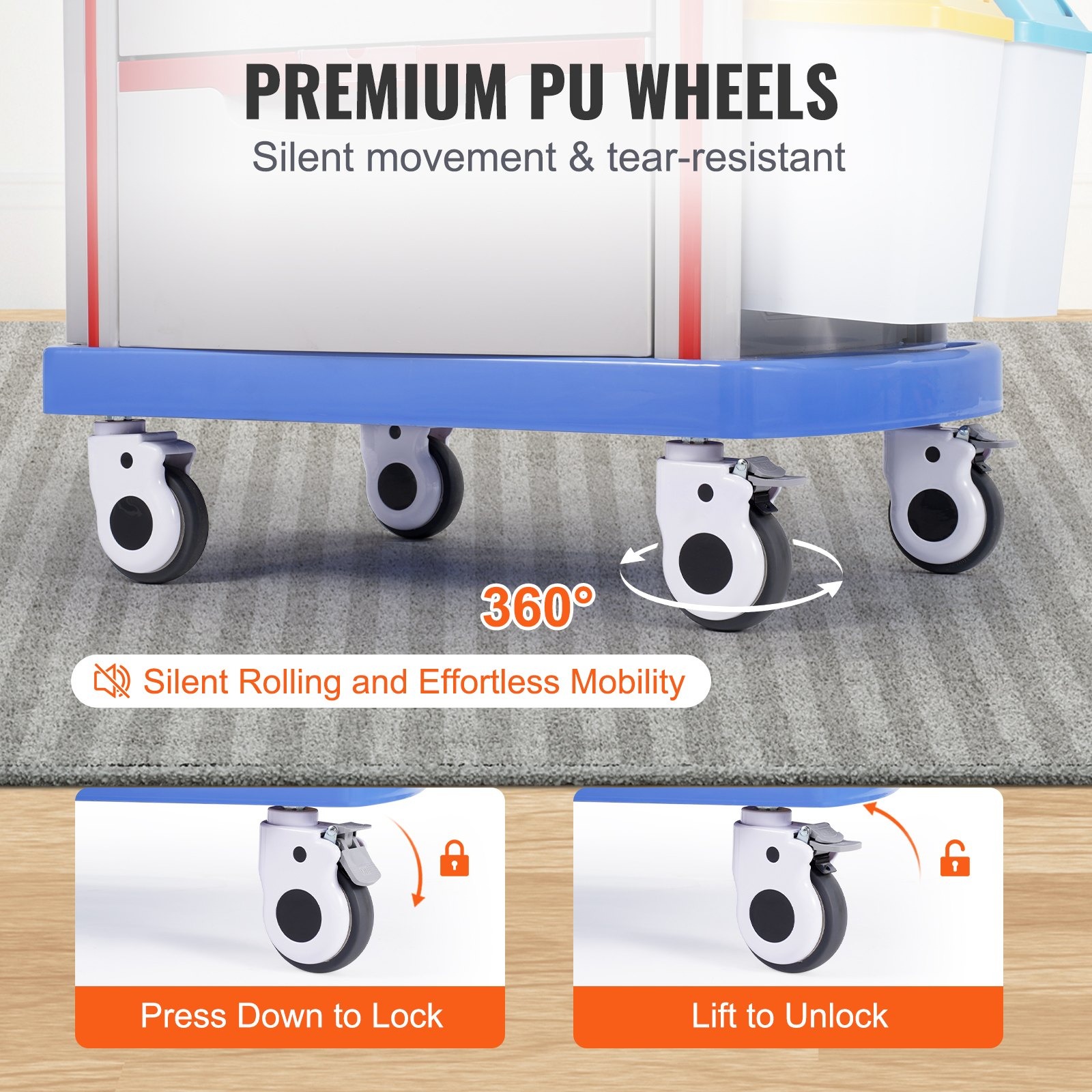 Медицинска реанимационна количка VEVOR K-ET750A разполага с пет чекмеджета с различна дълбочина и горна работна повърхност, подходящи за организиране на медикаменти, инструменти и оборудване за спешни случаи. Подходяща е за използване в болници, спешни отделения, клиники, лаборатории и медицински центрове. Изработена е от високоплътен PP материал със стоманени усилвания, устойчив на удари и химикали при интензивна професионална употреба. Горната повърхност е с предпазни бордове против приплъзване и вградени електрически контакти за захранване на апаратура. Моделът издържа натоварване до 200 кг и е подходящ за тежко медицинско оборудване.