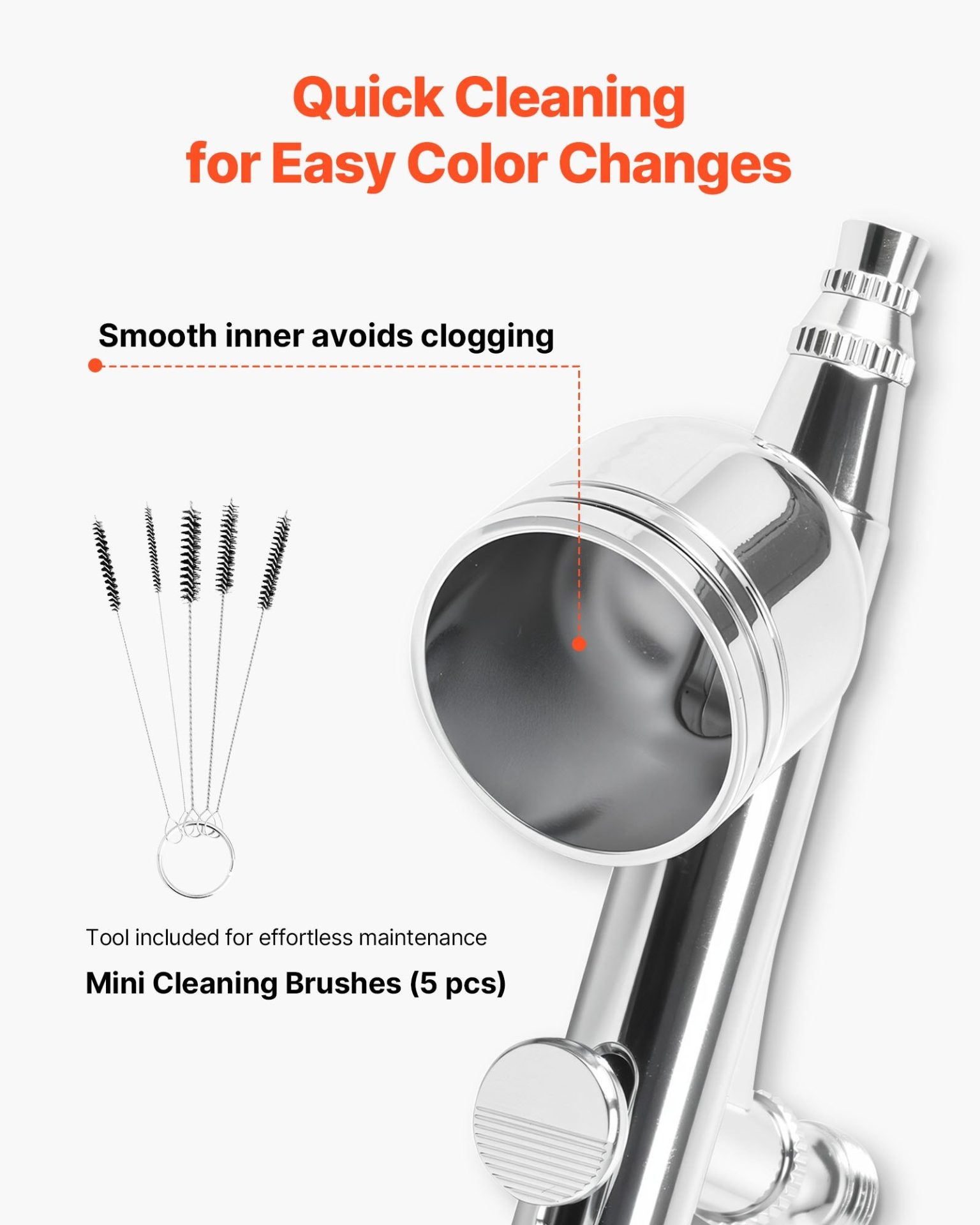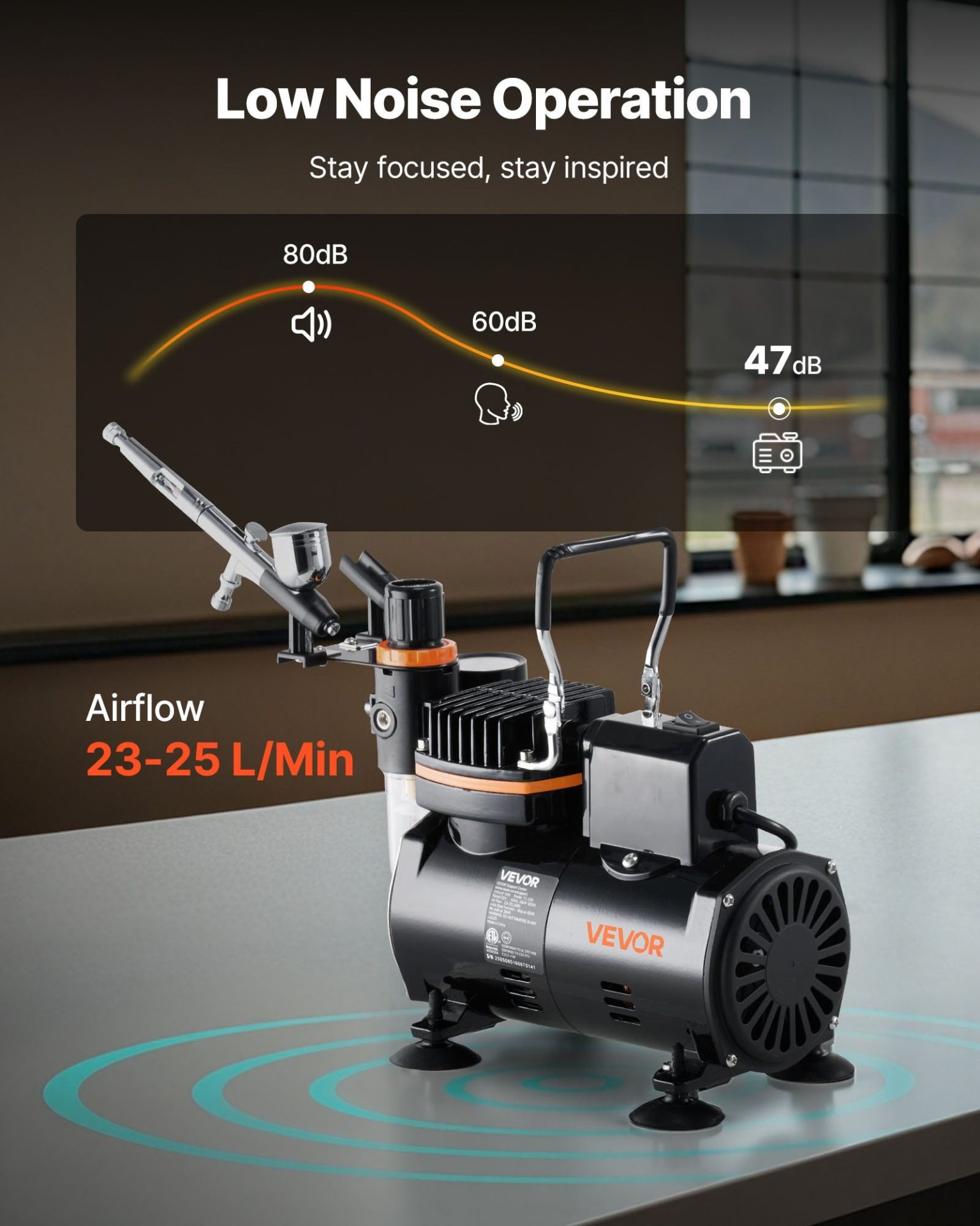 Аерограф с компресор VEVOR TC-20B3 разполага с мощност 120 W и стабилен дебит 23-25 литра в минута. Това осигурява равномерен въздушен поток при пръскане и по-добър контрол върху резултата. Системата работи тихо и позволява по-спокойна работа при по-дълги сесии, без излишен шум и напрежение.