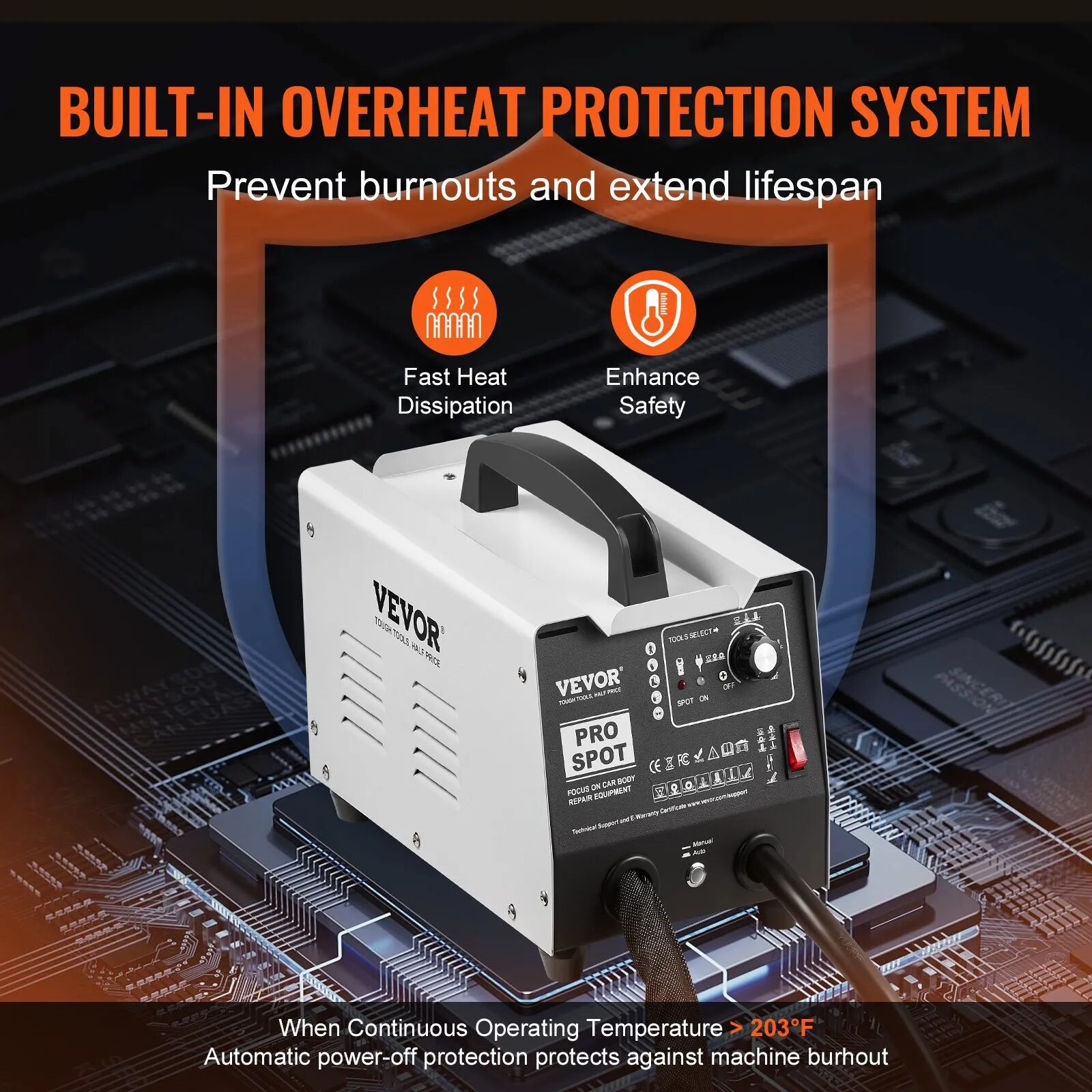 Системата за интелигентна защита от прегряване се активира при температура над 95°C и предпазва уреда от късо съединение и повреда. Vevor PRO се отличава и с пълен набор от аксесоари, подредени в удобна кутия, за да имате всичко необходимо под ръка.