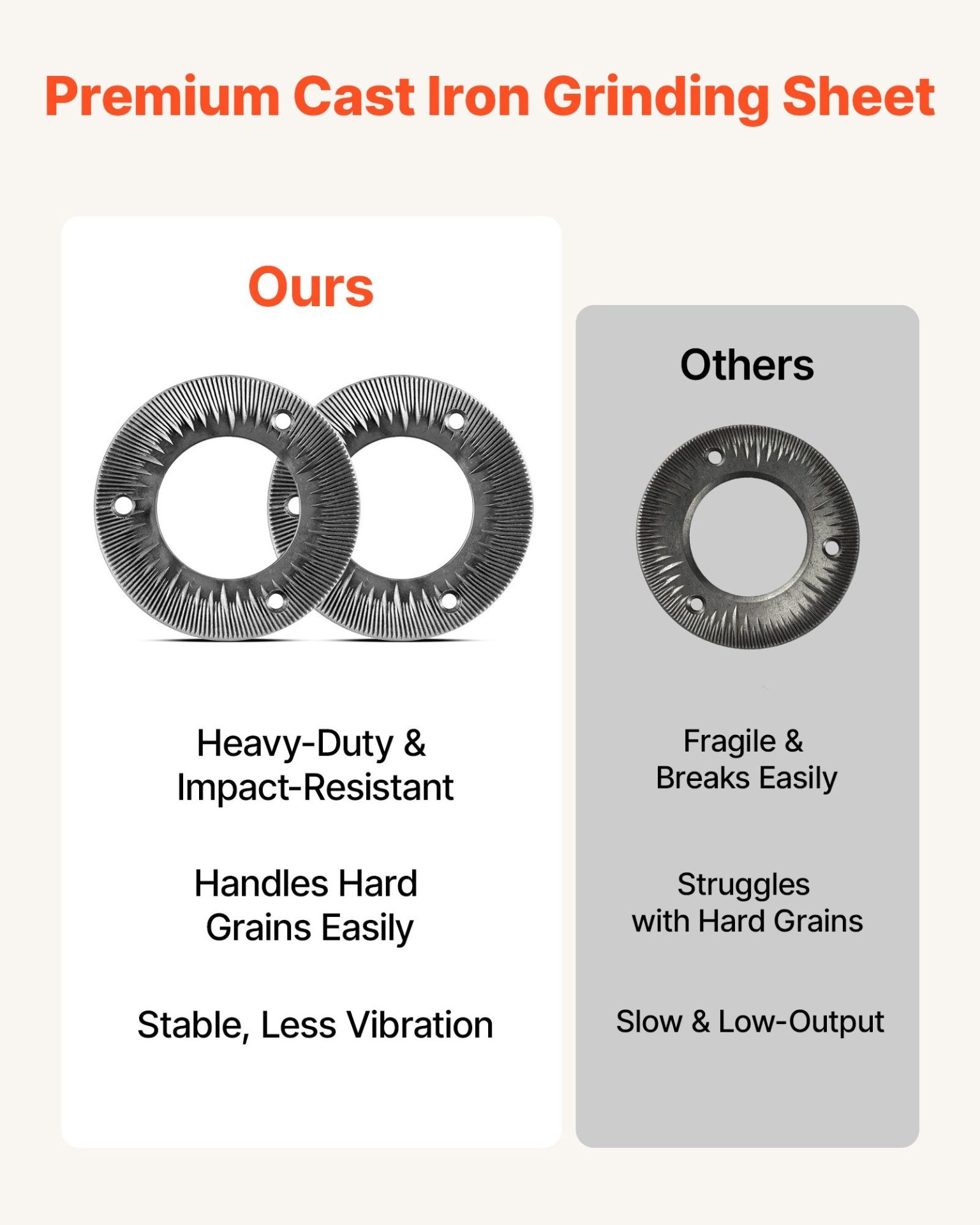 Дискове за мелница VEVOR MP-02G, 2 броя, Чугунени, За сухо смилане, съвместими с фуражомелки VEVOR GM-001/002/003