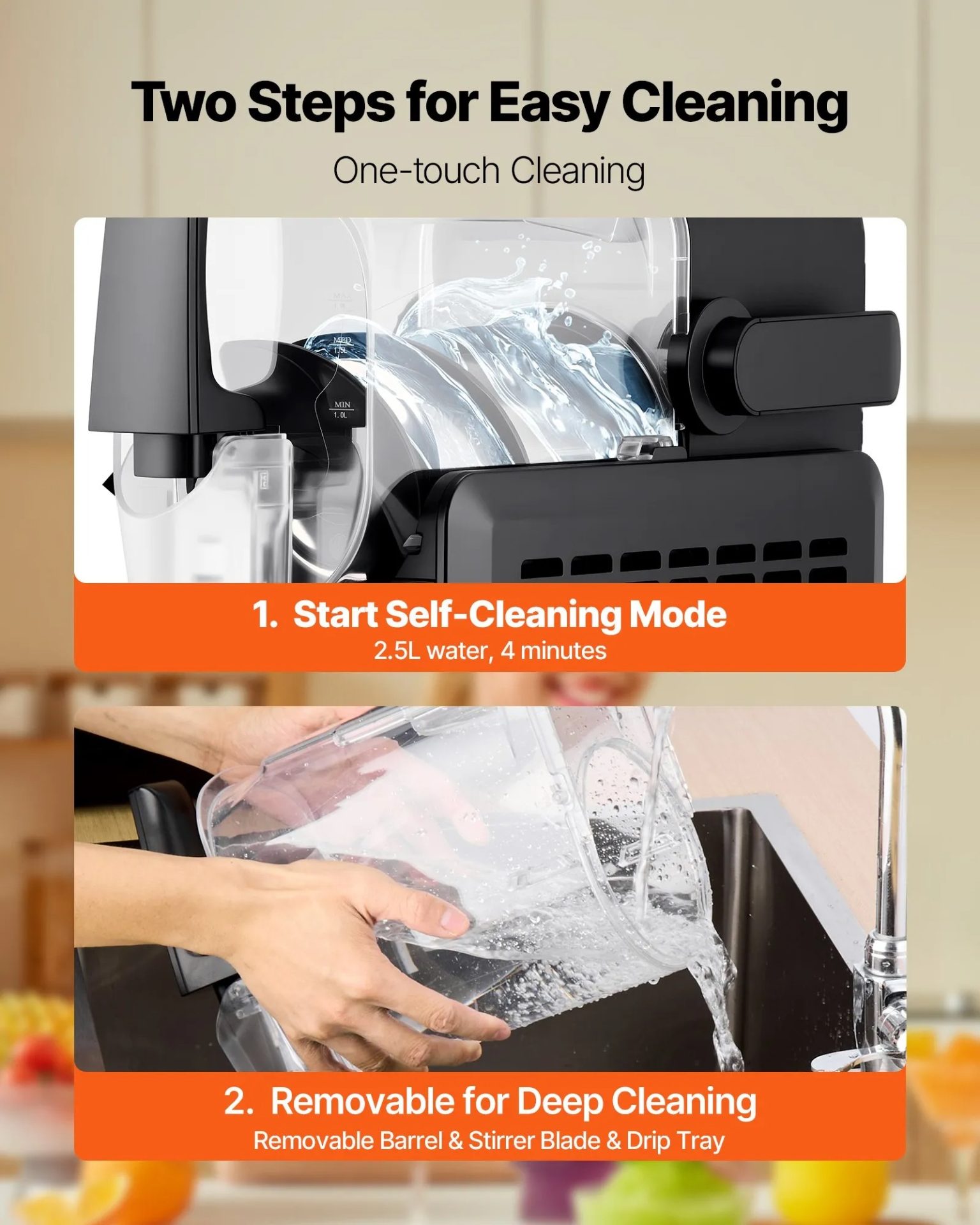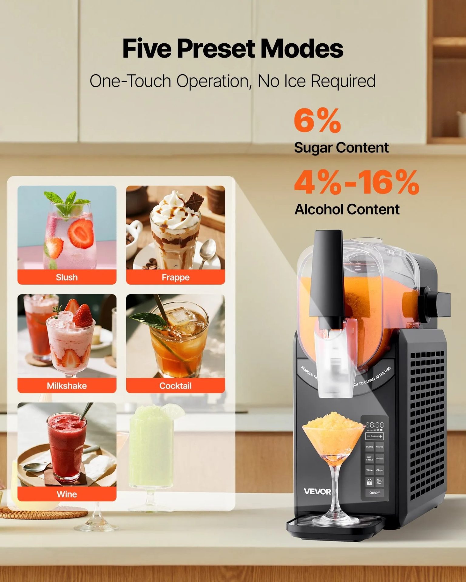 Домашната скрежина машина VEVOR ISM2623D съчетава удобство, бързина и модерна технология, за да превърне приготвянето на замразени напитки в удоволствие. Вместимостта от 2.6 литра осигурява по-голям обем и по-голяма свобода за различни рецепти у дома. Машината разполага с пет предварително зададени програми, позволяващи приготвяне на млечни скрежини, коктейли, кафе напитки, винени миксове и ежедневни ледени напитки с едно натискане на бутон. Не е нужно добавяне на лед или предварително охлаждане на съставките. Уредът работи с мощен компресор и 360-градусови бъркалки, които осигуряват равномерно замразяване и гладка текстура.