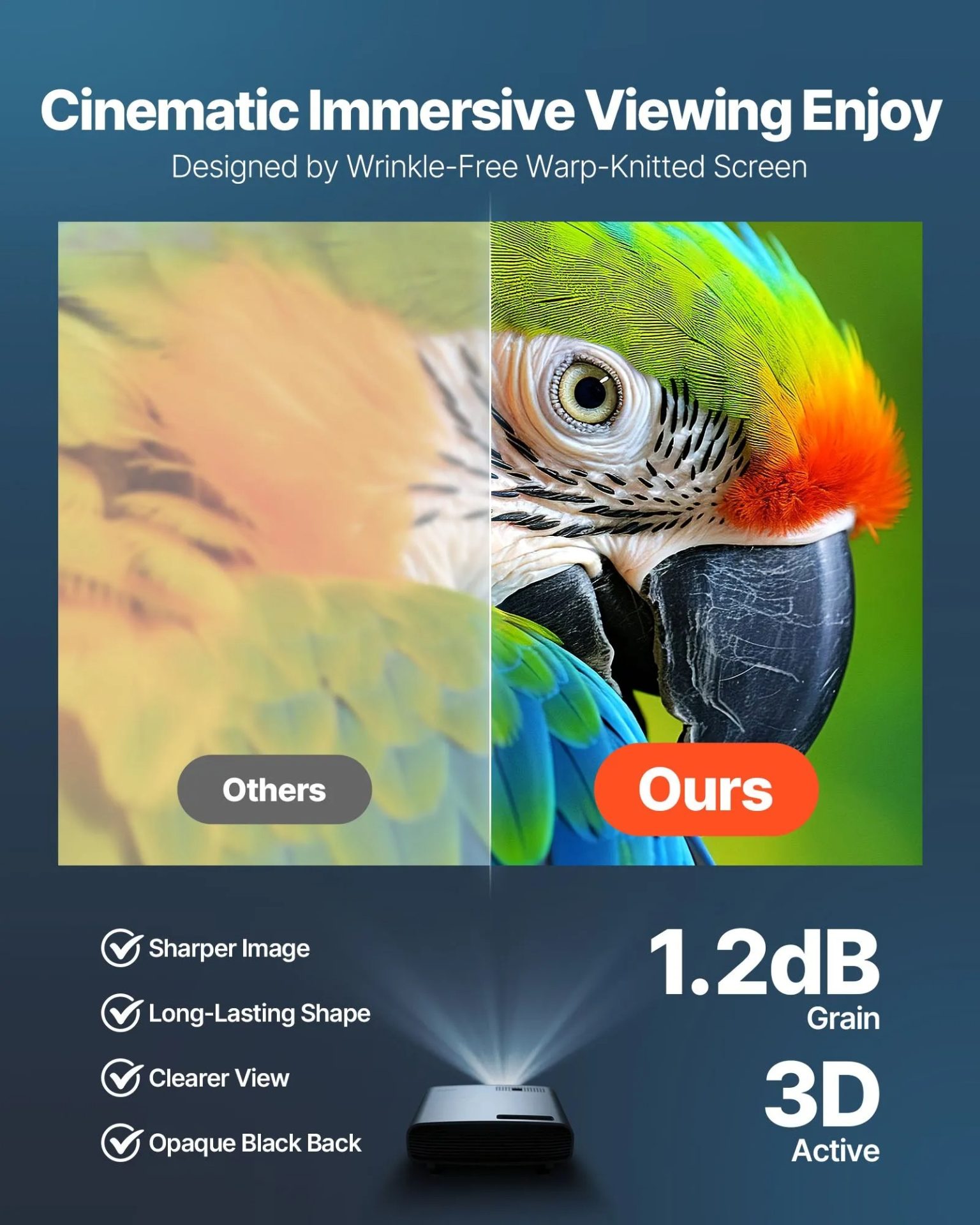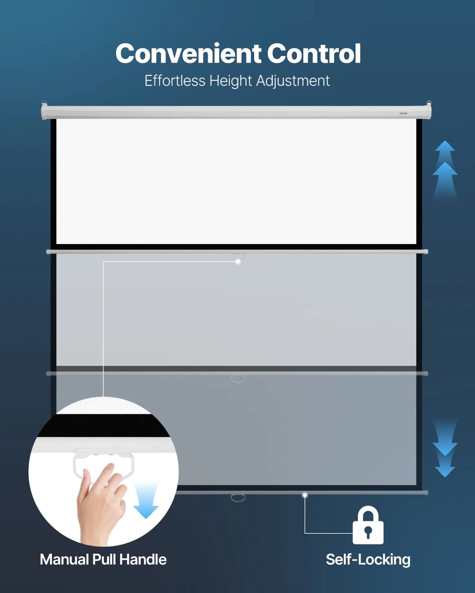 Екран за проектор VEVOR WS120 използва бяло PVC платно с матово покритие и коефициент на отражение 1.2. Повърхността поддържа 4K, 3D и HD прожекция с равномерна яркост във всички зони на платното. Работната площ е 2134 x 2134 мм при съотношение 1:1. Дебелината е 0.35 мм, което поддържа добро опъване и гладка структура.