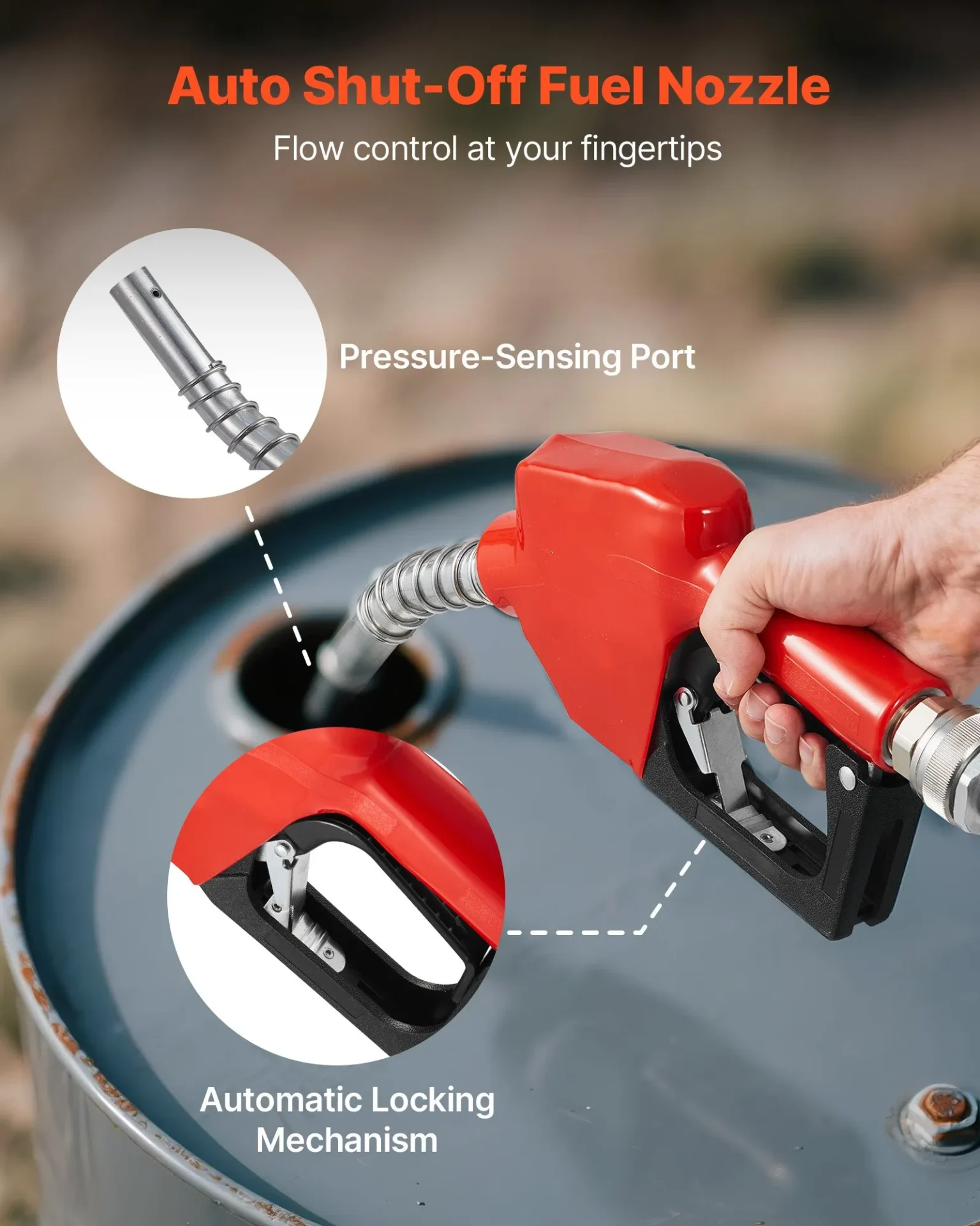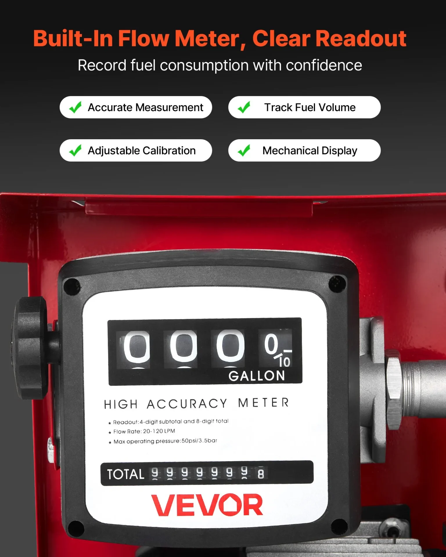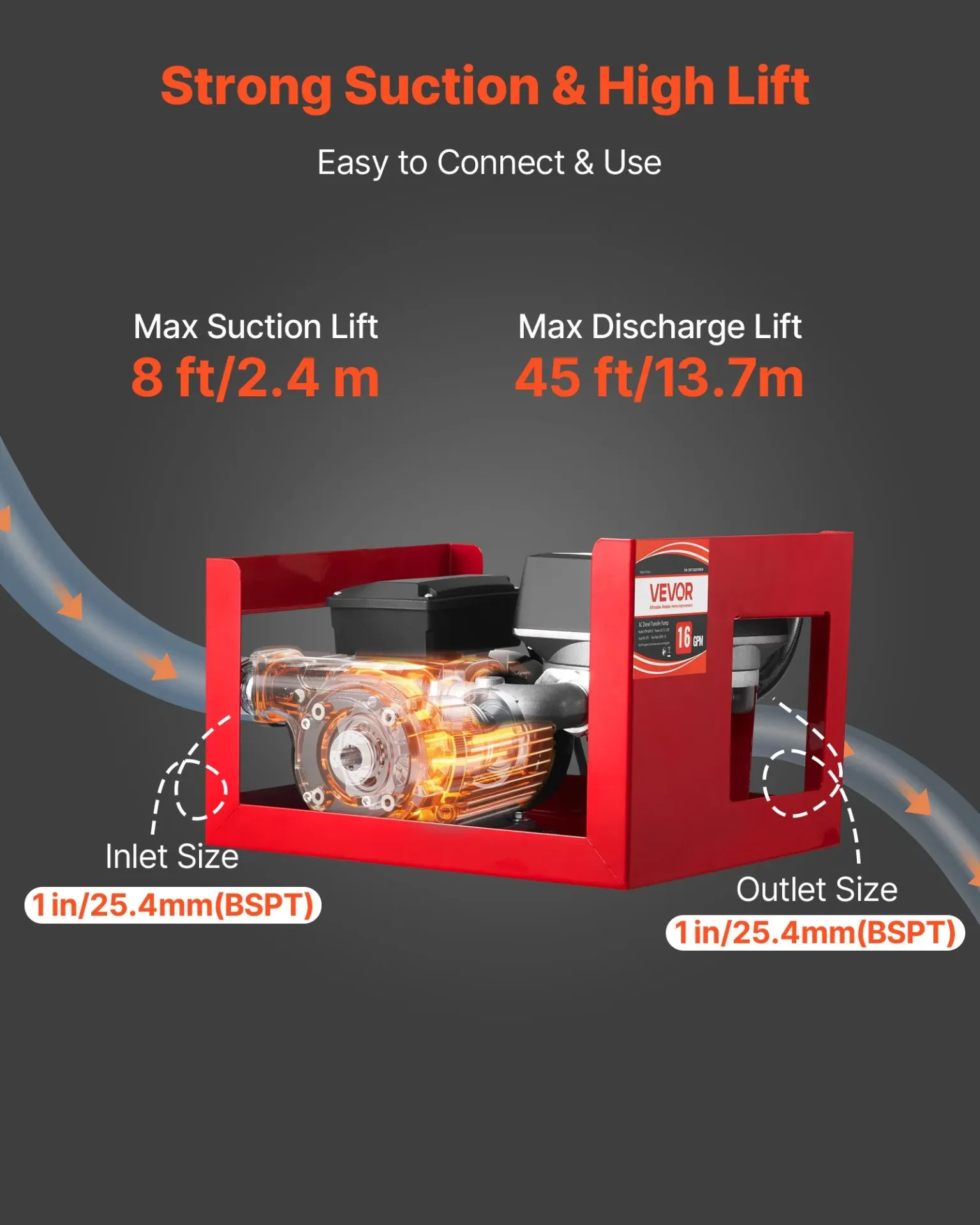 Помпата е с максимална височина на засмукване 2.4 метра и максимална височина на изпомпване 13.7 метра, което позволява лесно зареждане на резервоари, разположени на по-високо ниво. Вграденият разходомер показва точно количеството прехвърлено гориво и улеснява контрола при зареждане.