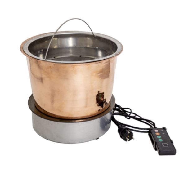 Малкият електрически меден казан DES с обем 10 литра е изработен от висококачествена електролитна мед и е оборудван с вграден нагревател с мощност 2 kW. Благодарение на компактната си конструкция и електрическо загряване, медният казан е напълно самостоятелен и удобен за използване в затворени помещения. Основният съд и капакът са съединени чрез стоманен обръч с бърза връзка, осигуряващ плътност и сигурност по време на работа.