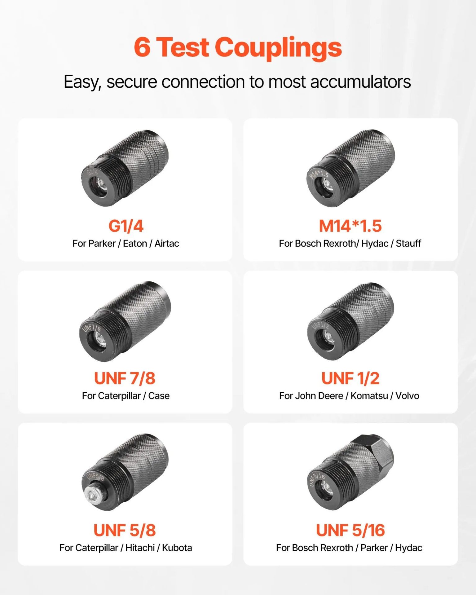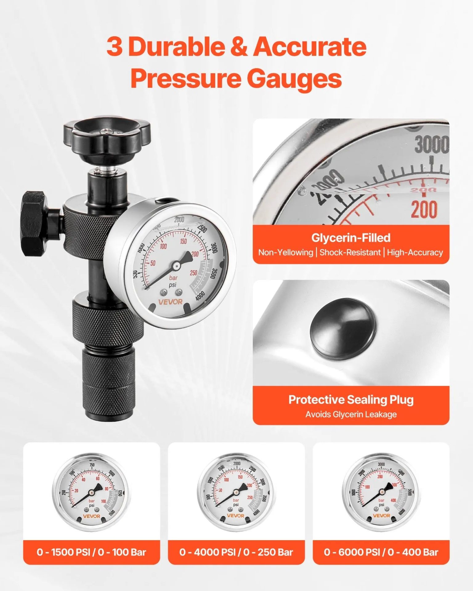 Хидравличният комплект за пълнене с азот Vevor YS-0200D позволява точно измерване и зареждане с азот на хидравлични акумулатори, бутилки и системи под налягане. Подходящ е за сервизи, фермерска техника и тежка строителна техника като багери, товарачи и булдозери. Комплектът е оборудван с три прецизни манометъра за измерване на налягане до 100 bar, 250 bar и 400 bar, което покрива всички нужди при тестове и калибриране. Манометрите са запълнени с глицерин, който стабилизира стрелката и елиминира вибрациите по време на измерване. Корпусът им е изработен от неръждаема стомана 304, устойчива на корозия, висока температура и механично натоварване.