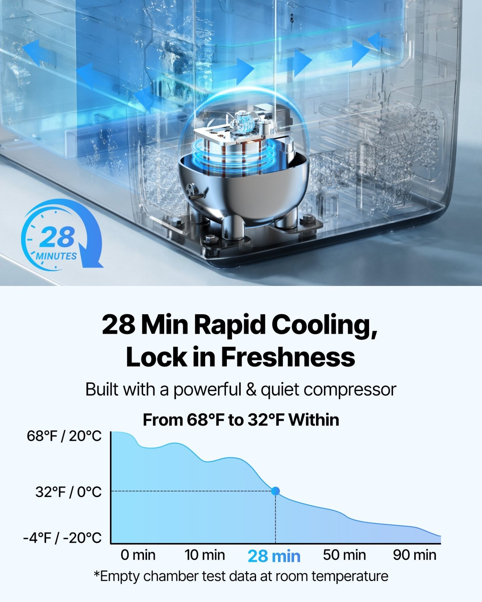Хладилникът може да свали температурата от 20°C до 0°C приблизително за около 28 минути. Налични са два режима на работа – MAX режим за по-бързо охлаждане и ECO режим за по-ниска консумация на електроенергия. Нивото на шум е ниско и е подходящо за използване в автомобил, кемпер или каравана.