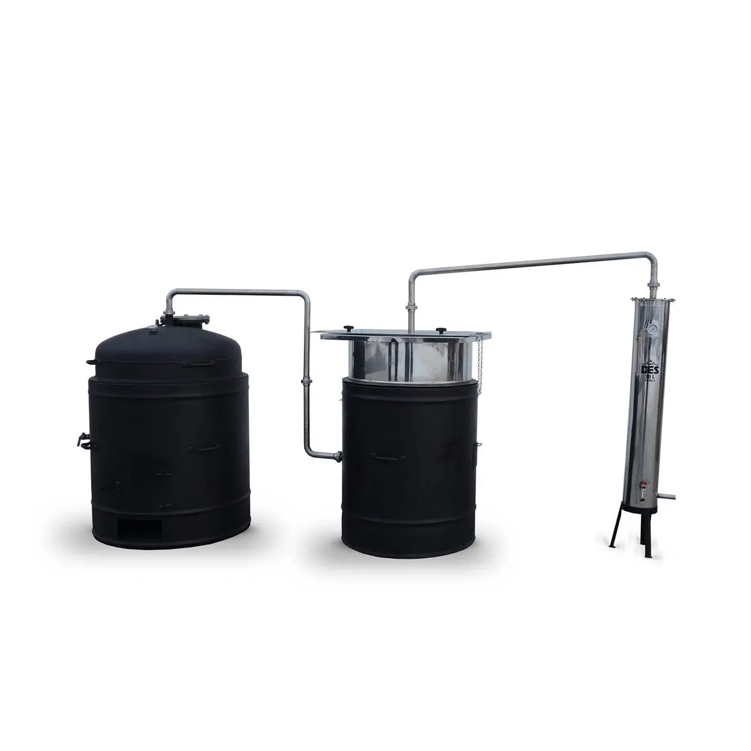 Казанът за етерични масла DES е предназначен за извличане на етерични масла и ароматна вода от билки и растения като лавандула, роза, лайка, мента и маточина чрез парна дестилация. Конструкцията е изработена изцяло от неръждаема стомана AISI 304 (Inox) и се състои от долен съд с вместимост 255 литра за вода, горен съд с обем 275 литра за билките, свързваща тръба и проточен охладител PH30L. Дъното на втория съд, в който се поставят растенията, е перфорирано с отвори Ø6 мм, разположени по цялата му повърхност. Целта на тази перфорация е да позволи на водната пара свободно да преминава през горната част на съда, тоест през билките. Загряването на професионалният казан за етерични масла се извършва с дърва или с газ.