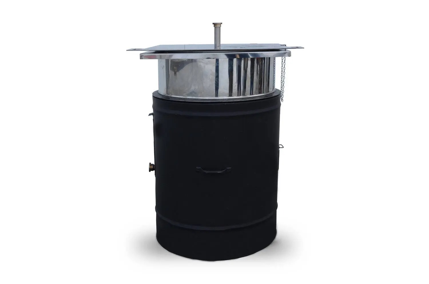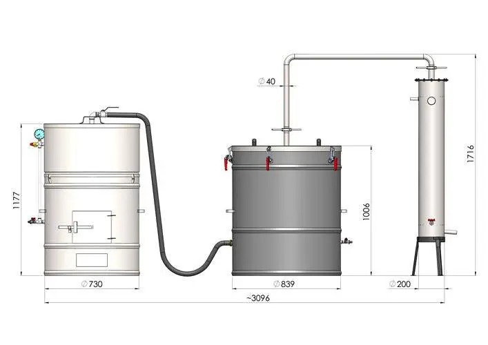 Долният съд с вместимост 255 литра се пълни с вода до около 50% от капацитета си (приблизително 125 литра). В това пространство се създава основата на процеса – парната дестилация, при която водата се нагрява и се превръща в гореща пара. Тя преминава нагоре към втория съд, където се намират билките. Парата постепенно извлича ароматните съединения и ги пренася към охладителя, превръщайки се в чист дестилат. Това количество вода е напълно достатъчно за един пълен цикъл на работа, като при следващите процеси изпарената част просто се долива.