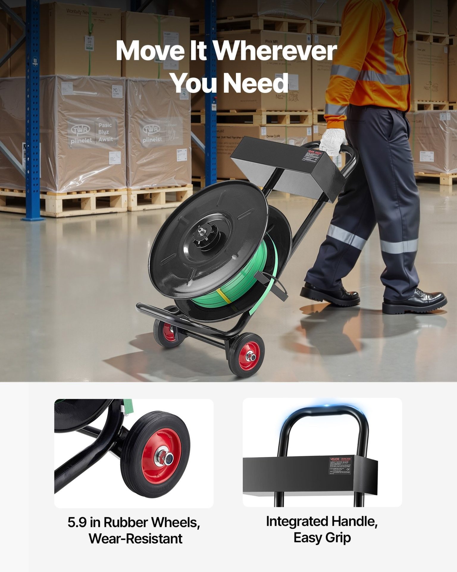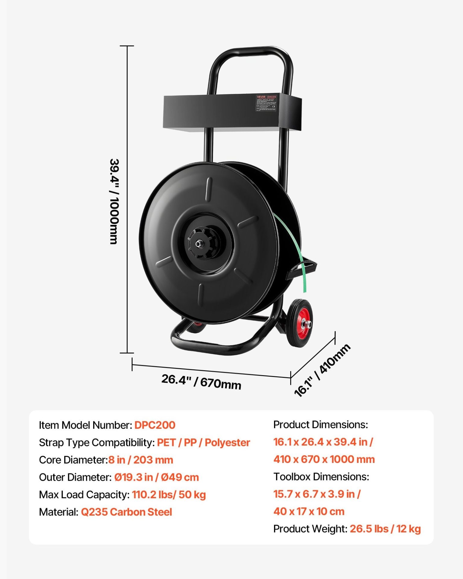 Количката за чембер лента VEVOR DPC200 е съвместима с ролки с вътрешен диаметър 203 mm. Подходяща е за PET, PP и полиестерни ленти, използвани в складове, логистични зони и производствени линии. Спирачният механизъм контролира развиването на лентата и предотвратява излишно отмотаване и оплитане при бързо опаковане.