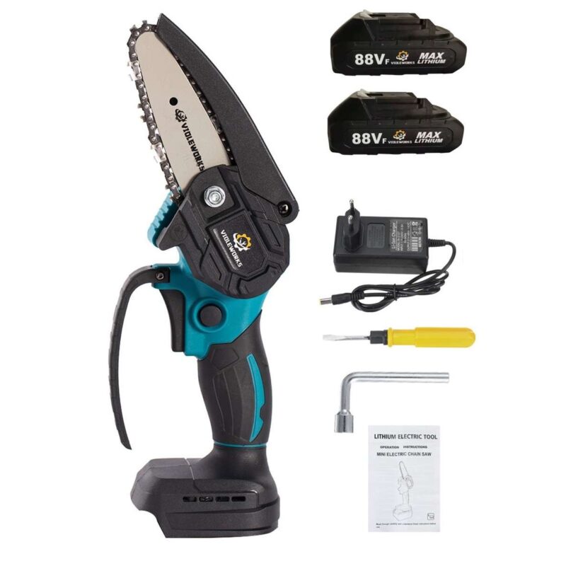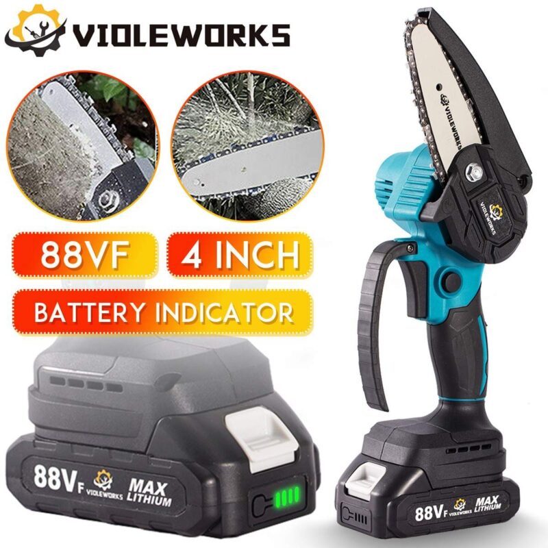 С акумулаторен електрически трион за клони Violeworks ще можете да отрежете клони, храсти, дъски и малки дръвчета. За да се избегнат потенциални рискове е поставена защита над веригата и бутон за заключване на спусъка. Електрическия трион разполага и със защита от прегряване и индикация за заряда на батерията, като всяка една черта съответства на 25% от заряда на батерията.