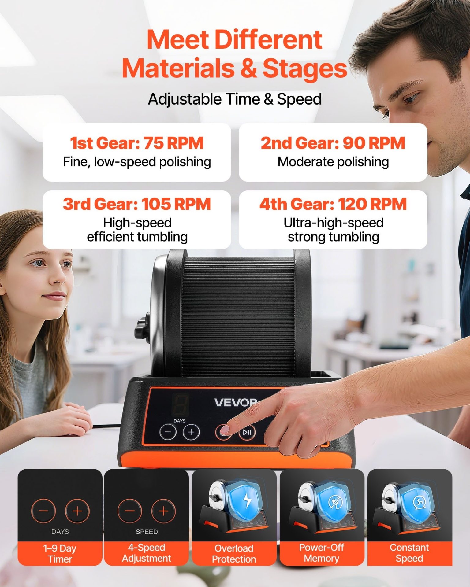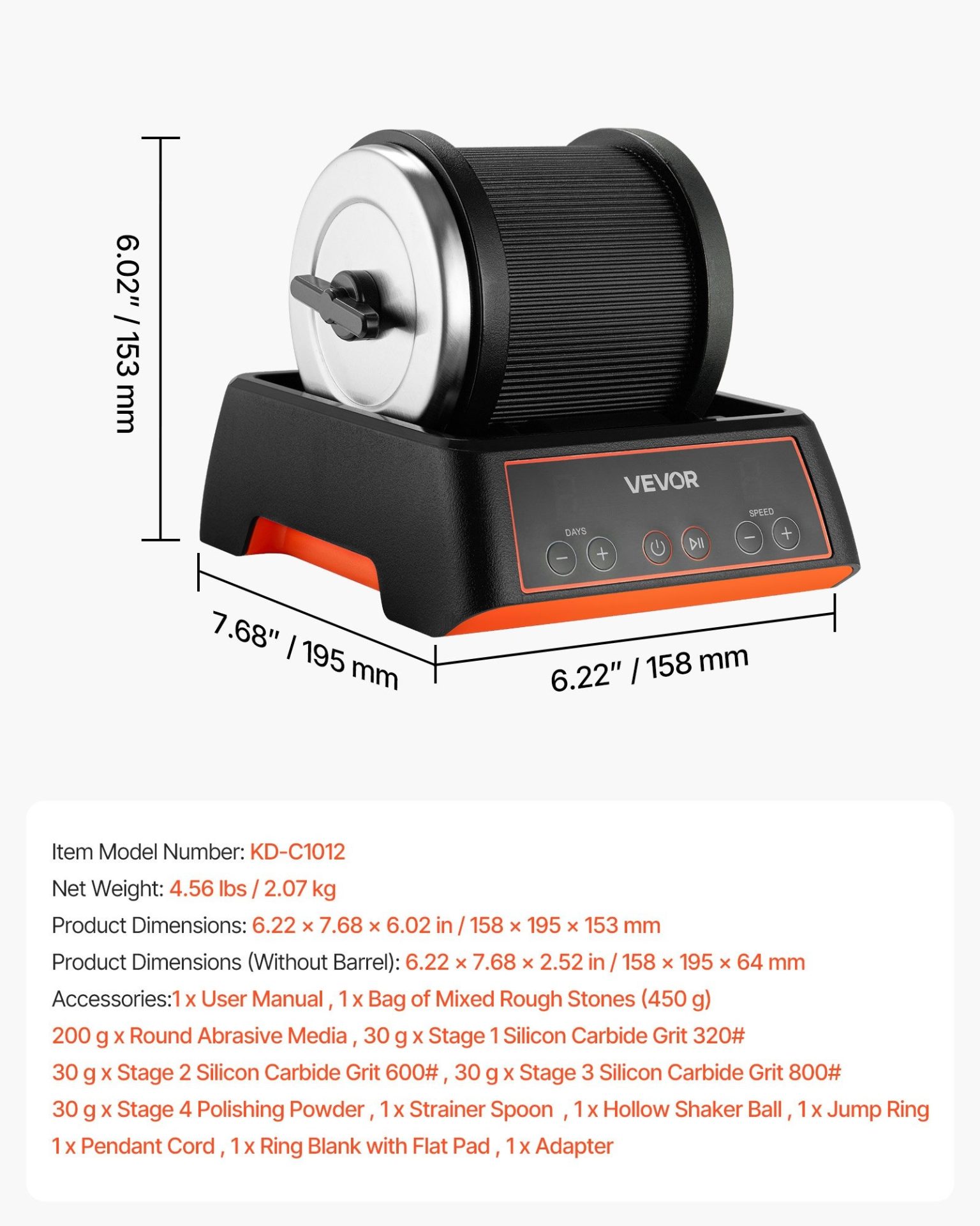 Машина за полиране на камъни VEVOR KD-C1012, Вместимост 1.1 кг, Таймер до 9 дни, 4 скорости, Безремъчен мотор с директно задвижване