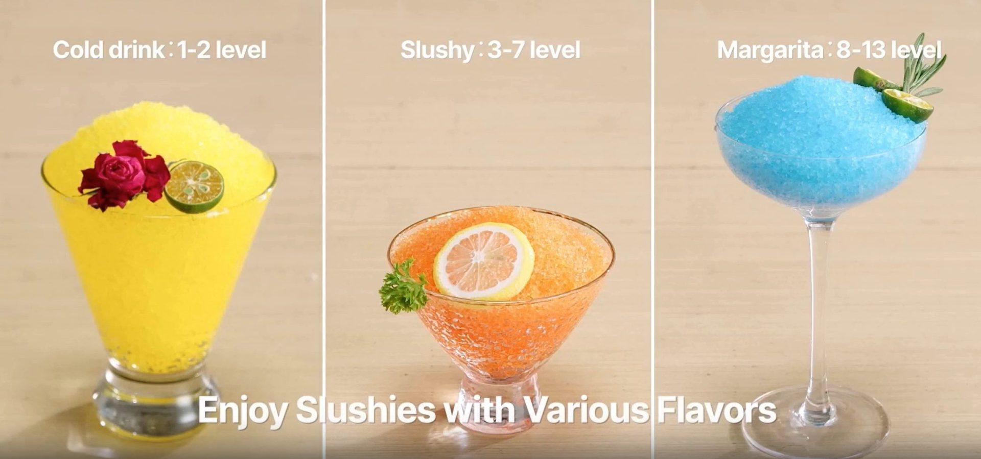 Машината позволява и приготвяне на замразени коктейли като маргарита и дайкири. При алкохолни рецепти е важно алкохолното съдържание в сместа да бъде контролирано, тъй като високият градус затруднява замръзването. Това се решава чрез по-нисък алкохолен процент в базовата смес и добавяне при сервиране, ако е необходимо.