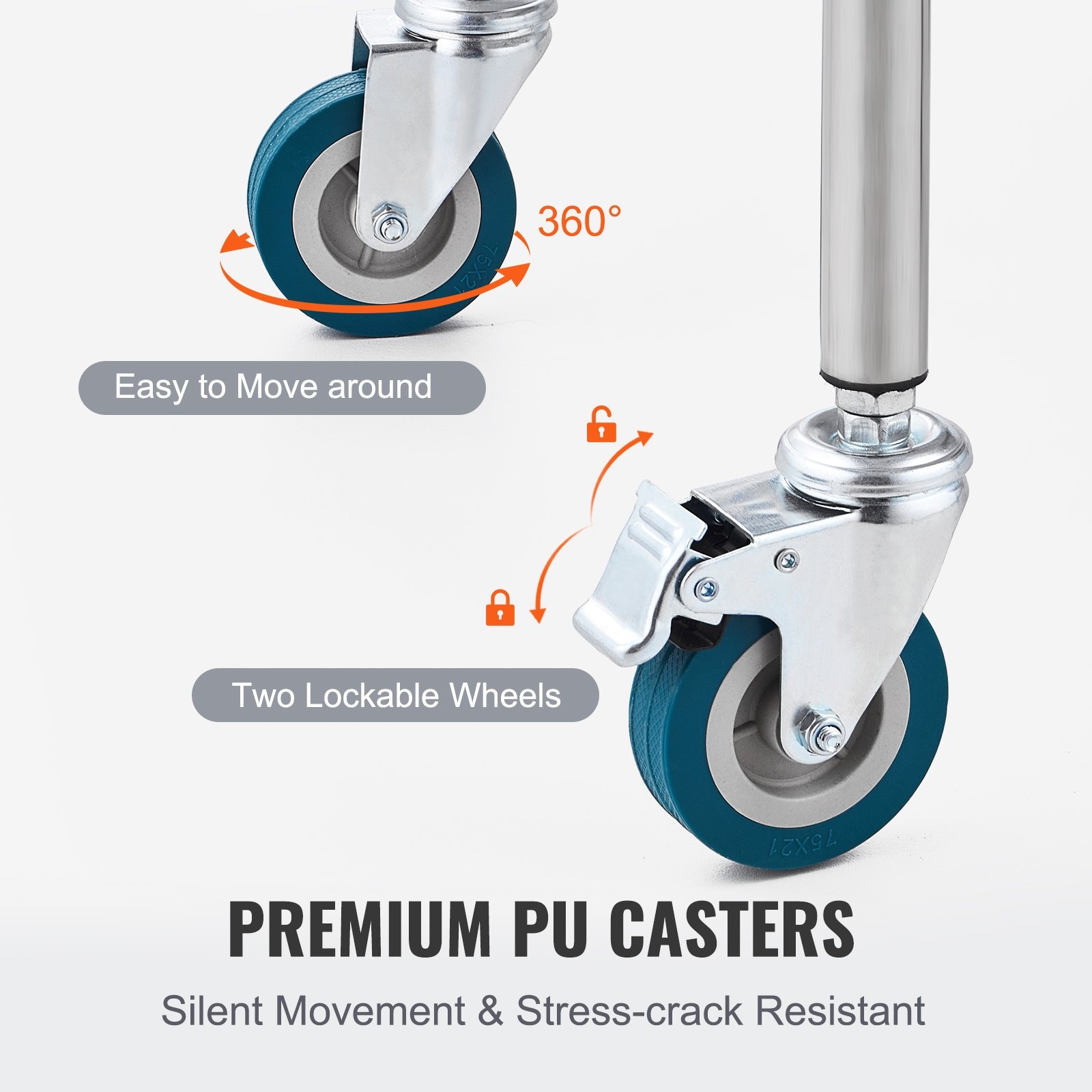 Медицинска и лабораторна количка VEVOR K-ST753 разполага с две работни нива, подходящи за съхранение и транспортиране на инструменти, апаратура и консумативи. Подходяща е за използване в лаборатории, медицински кабинети, клиники, болници, дентални практики и козметични студия. Изработена е от неръждаема стомана, устойчива на влага, корозия и интензивна ежедневна употреба. Двата рафта са с предпазни бордове, които предотвратяват изплъзване на предмети по време на движение. Моделът издържа натоварване до 100 кг и е подходящ за по-тежко оборудване и материали.