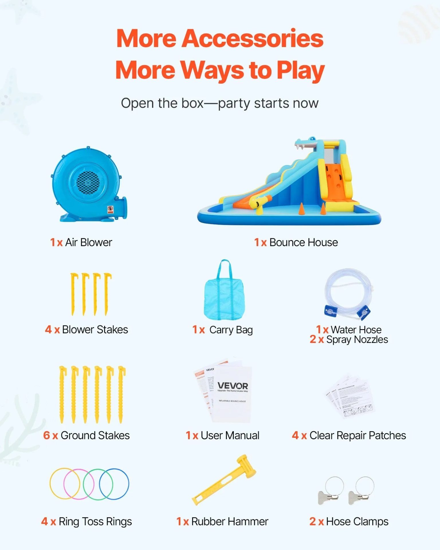 Надуваемият воден център VEVOR съчетава зона за скачане, стена за катерене, пързалка и плитък басейн в една обща конструкция. Разполага с различни елементи за игра, които задържат вниманието на децата по-дълго, без да се повтарят еднотипни занимания. Размерите 353 x 400 x 235 см покриват около 14 м² и позволяват едновременно забавление на 3 до 4 деца.