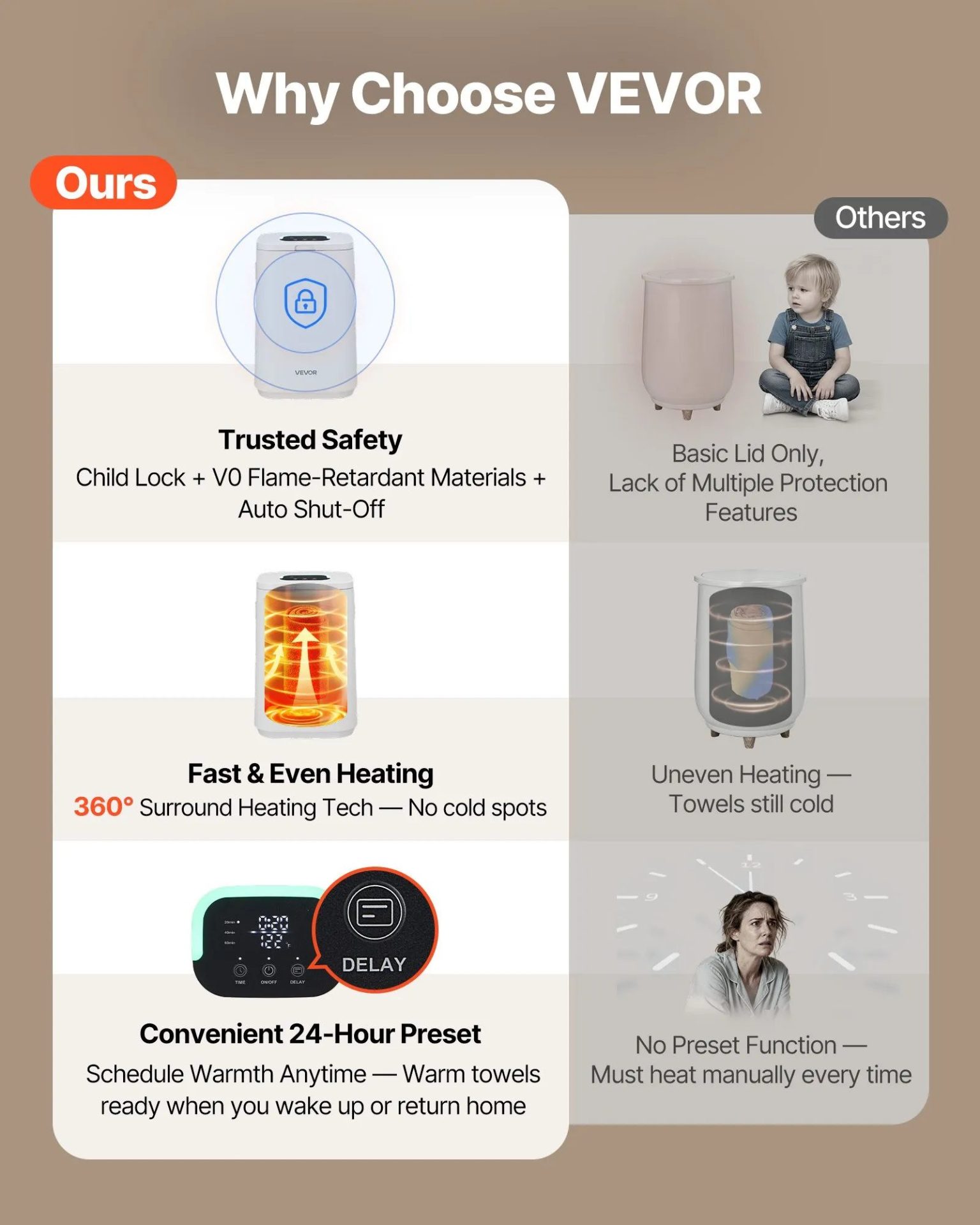 Нагревателят за хавлиени кърпи Vevor HSTW-12 осигурява топлина за хавлии, дрехи, халати и одеяла и създава усещане за домашен спа комфорт. Капацитетът е 20 литра и побира до 4 големи хавлии и е отличен избор както за семейства, така и за хора, които обичат уют и топлина след баня. Уредът е с 5 страни на затопляне и постига равномерно разпределение на топлината без зони, които остават хладни. Стените и дъното затоплят постепенно и осигуряват отлични резултати.