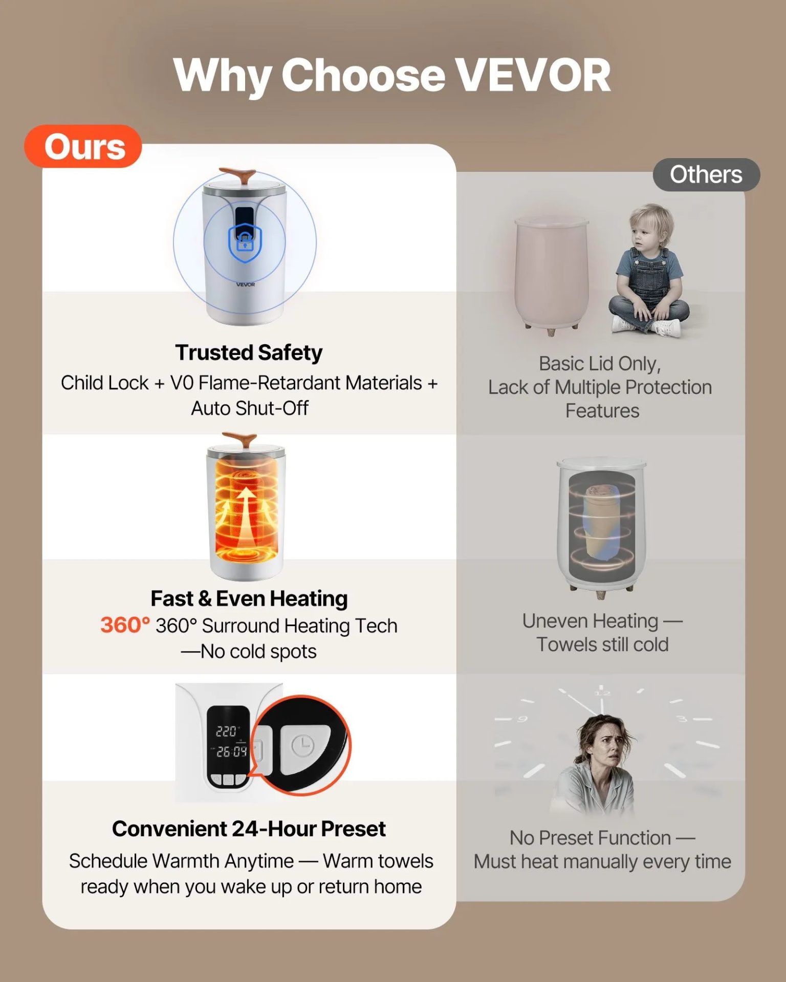 Нагревателят е с функция за автоматично изключване, която увеличава безопасността при използване. Детският бутон заключва управлението и предотвратява случайни натискания. Уредът е сертифициран по ETL и FCC и е отличен избор за подарък за нов дом или рожден ден. Дизайнът се вписва много добре в модерни бани и добавя усещане за комфорт и лукс.