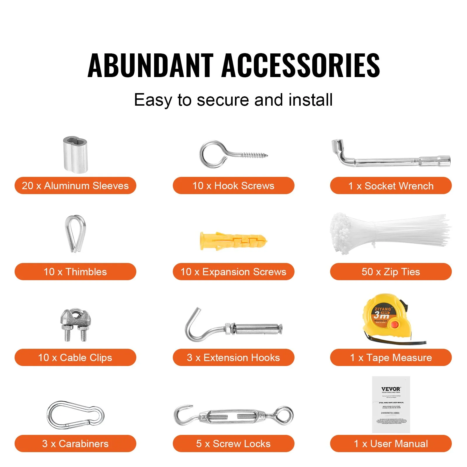 Стоманеното въже Vevor е изработено от висококачествена 304 неръждаема стомана и е създадено за дълготрайна употреба на открито. Материалът е обогатен с молибден и осигурява по-добра устойчивост на корозия, окисляване и атмосферни влияния. Подходящо решение за монтаж при огради, парапети, тераси и дворни конструкции, където се изисква здравина и дълъг експлоатационен живот.