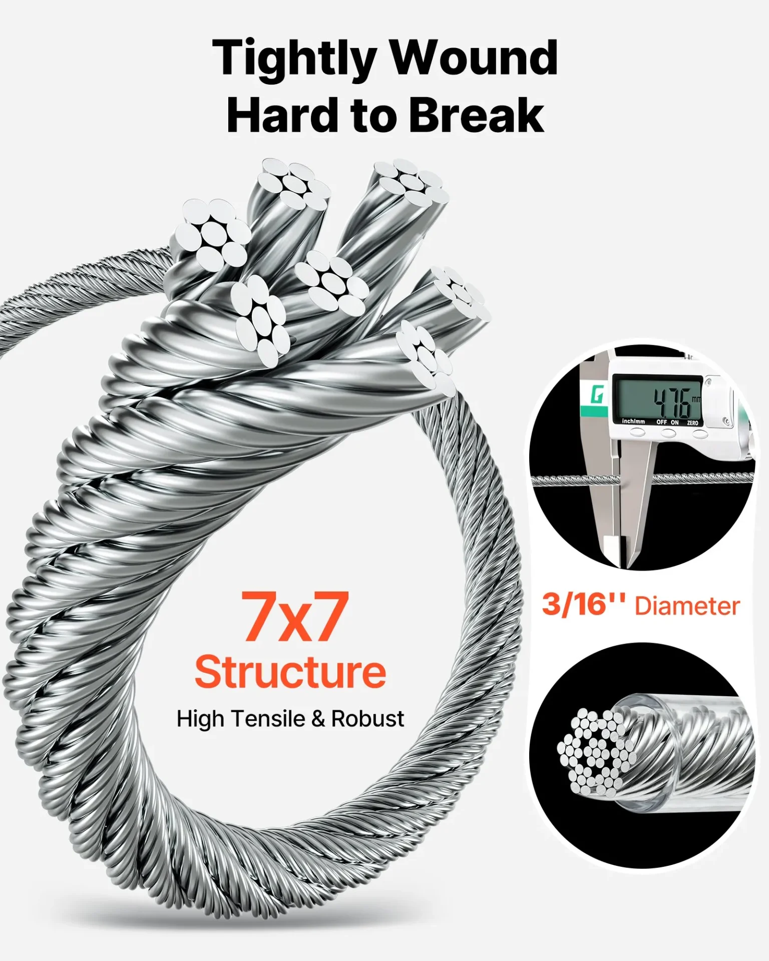Стоманеното въже Vevor е изработено от неръждаема стомана 304 и е предназначено за дълготрайна употреба както на открито, така и на закрито. Конструкцията е 7×7 нишки, което осигурява добър баланс между здравина и гъвкавост. Покритието от PVC предпазва въжето от влага, корозия и износване при продължително използване. Повърхността е гладка и без остри ръбове, което улеснява работата и намаля риска от наранявания при монтаж.