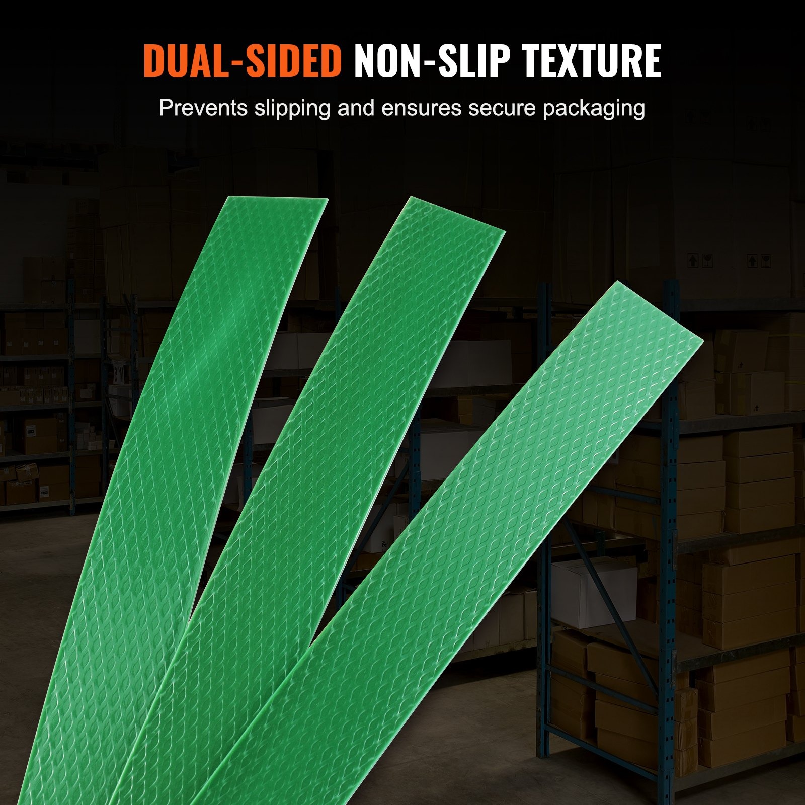 Полиестерната чембер лента VEVOR PET1200 комбинира висока здравина и еластичност, поддържайки стегнато фиксиране на товарите дори при вибрации и температурни промени. Подходяща е за тежки палети, дървен материал, тръби, тухли и метални изделия. Работи с ръчни и автоматични чембер машини с термично слепване.