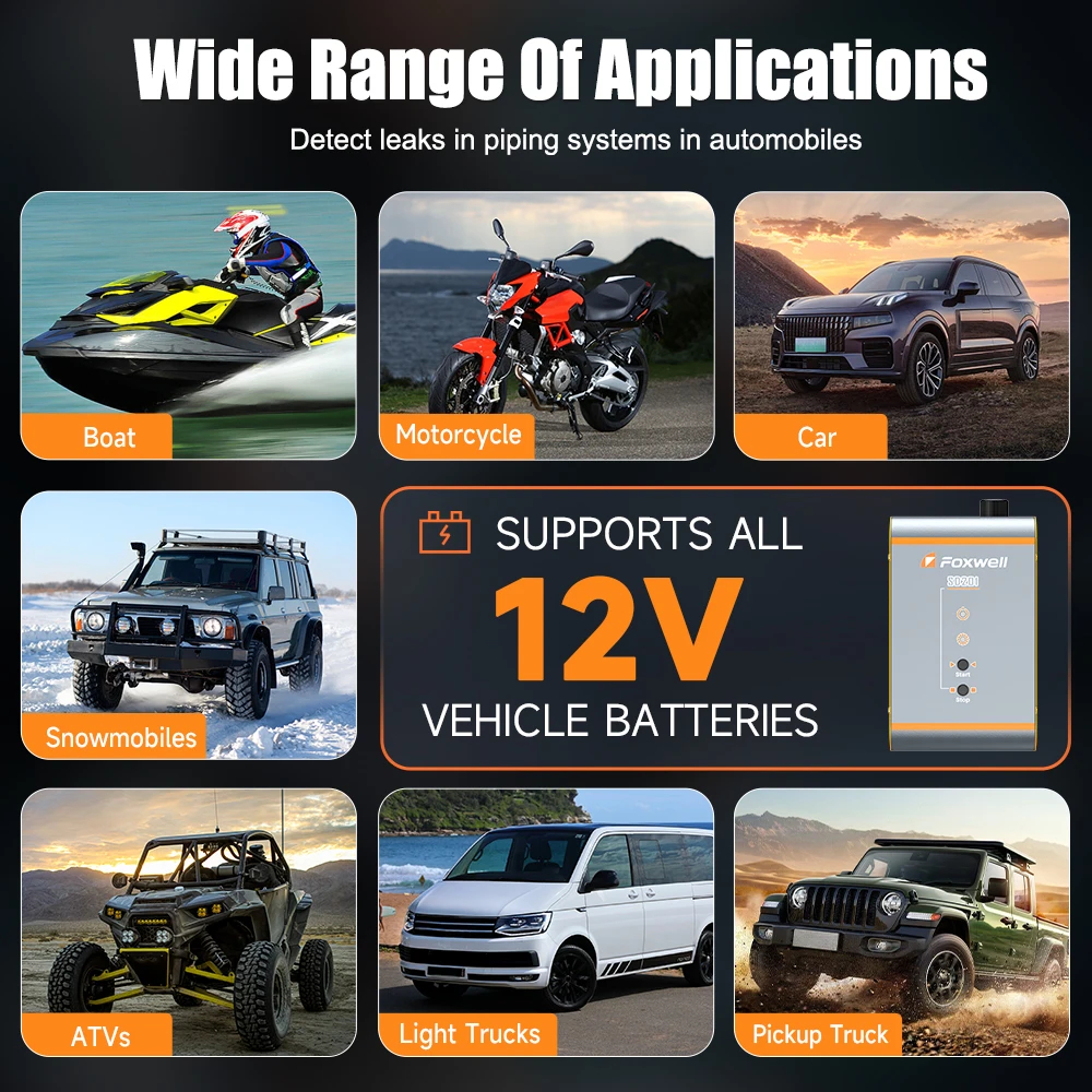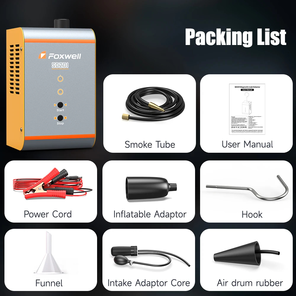 Димогенераторът Foxwell SD201 е предназначен за бързо и точно откриване на течове в различни автомобилни системи. Уредът работи с дим, който преминава през тръби, маркучи и съединения и визуално показва дори най-малките пропуски. Подходящ е за проверка на всмукателната система, картерната вентилация, горивната система, изпускателната система, турбопътища и други затворени контури.