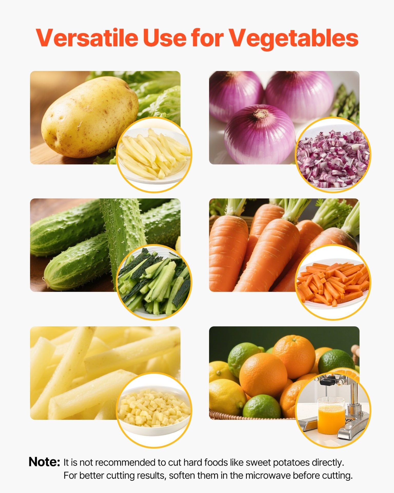 Ръчната картофорезачка VEVOR разполага с три ножа за рязане на картофи и зеленчуци в различни размери, както и допълнителен диск за обработка на плодове. Осигурява равномерни пръчици при всяко натискане и поддържа постоянен резултат при работа с повече порции.