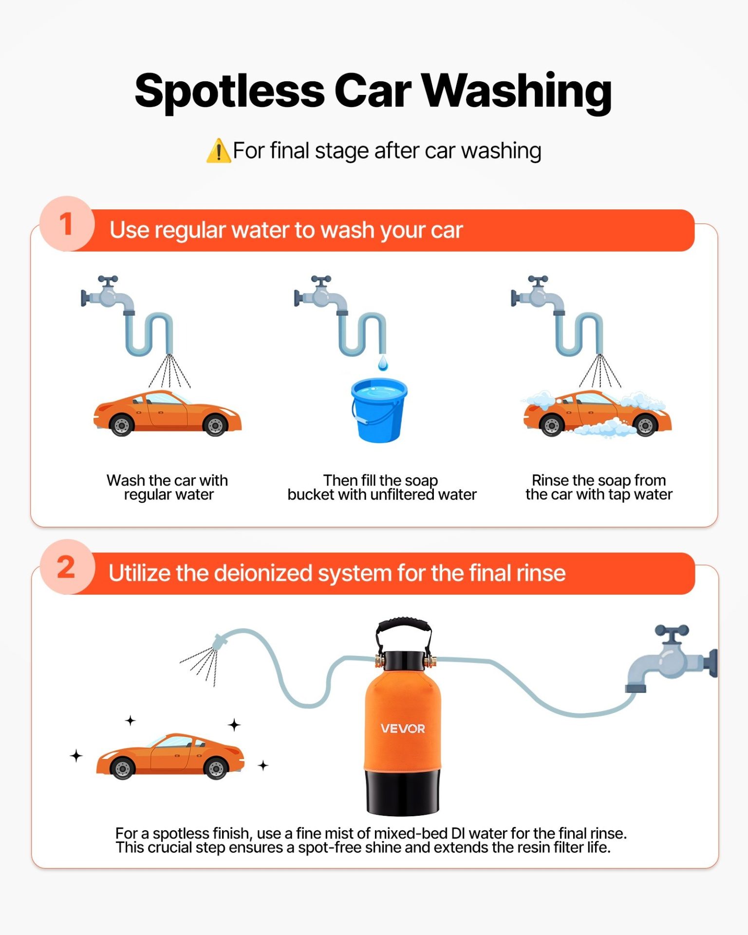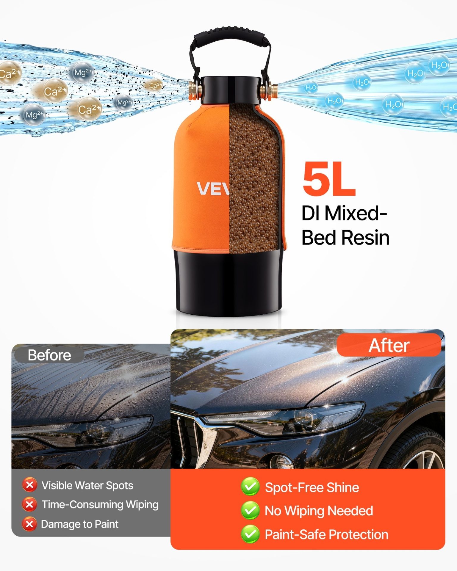Системата за дейонизиране на вода се използва като финален етап при измиване, при който повърхността изсъхва без варовикови следи. Вътрешността съдържа 5 литра смесена йонообменна смола, която премахва калций, магнезий и разтворени йони, като намалява TDS и елиминира нуждата от подсушаване. Подходяща за автомобили, каравани, мотори, лодки, прозорци и соларни панели, където крайният резултат трябва да остане чист без остатъци.