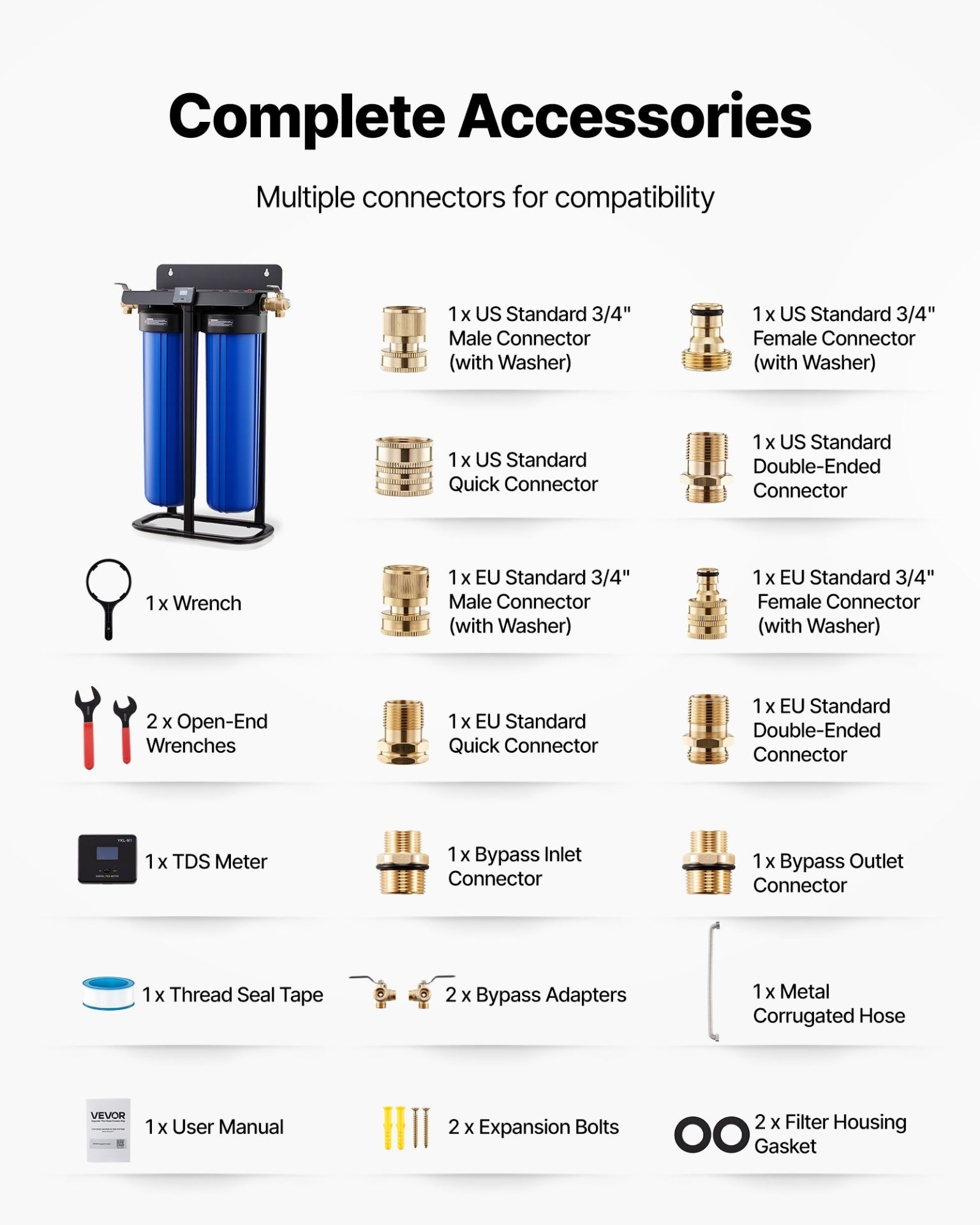 Капацитетът достига до около 1250 литра при входна вода 200 ppm, което осигурява стабилна работа при редовна употреба. Вграденият TDS метър позволява контрол на качеството на водата и навременна смяна на смолата при стойности около 30 ppm. Системата разполага с байпас режим за предварително измиване с чешмяна вода и режим на филтрация за финално изплакване. Конструкцията включва подова стойка за стабилно позициониране, като позволява и стенен монтаж при необходимост. В комплекта са включени EU и US конектори за различни връзки.