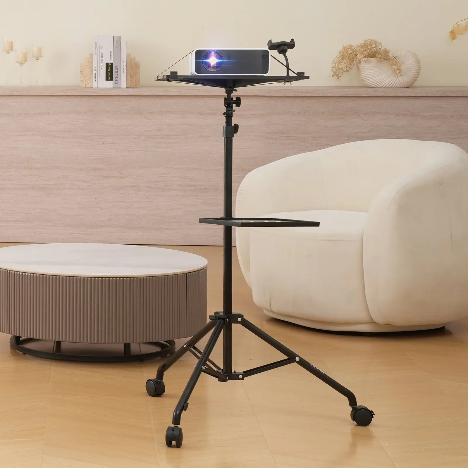 Стойка за проектор и лаптоп VEVOR ZG-SJJTY-JL предлага удобна и подредена работна среда за презентации, прожекции и студийни задачи. Конструкцията комбинира голям основен плот и втори помощен рафт за техника, осигурявайки стабилно позициониране и лесно регулиране на височината от 85 до 170.5 см. Мобилната основа с три ABS колела и възможност за заключване позволява бързо преместване и сигурен контрол върху позицията.