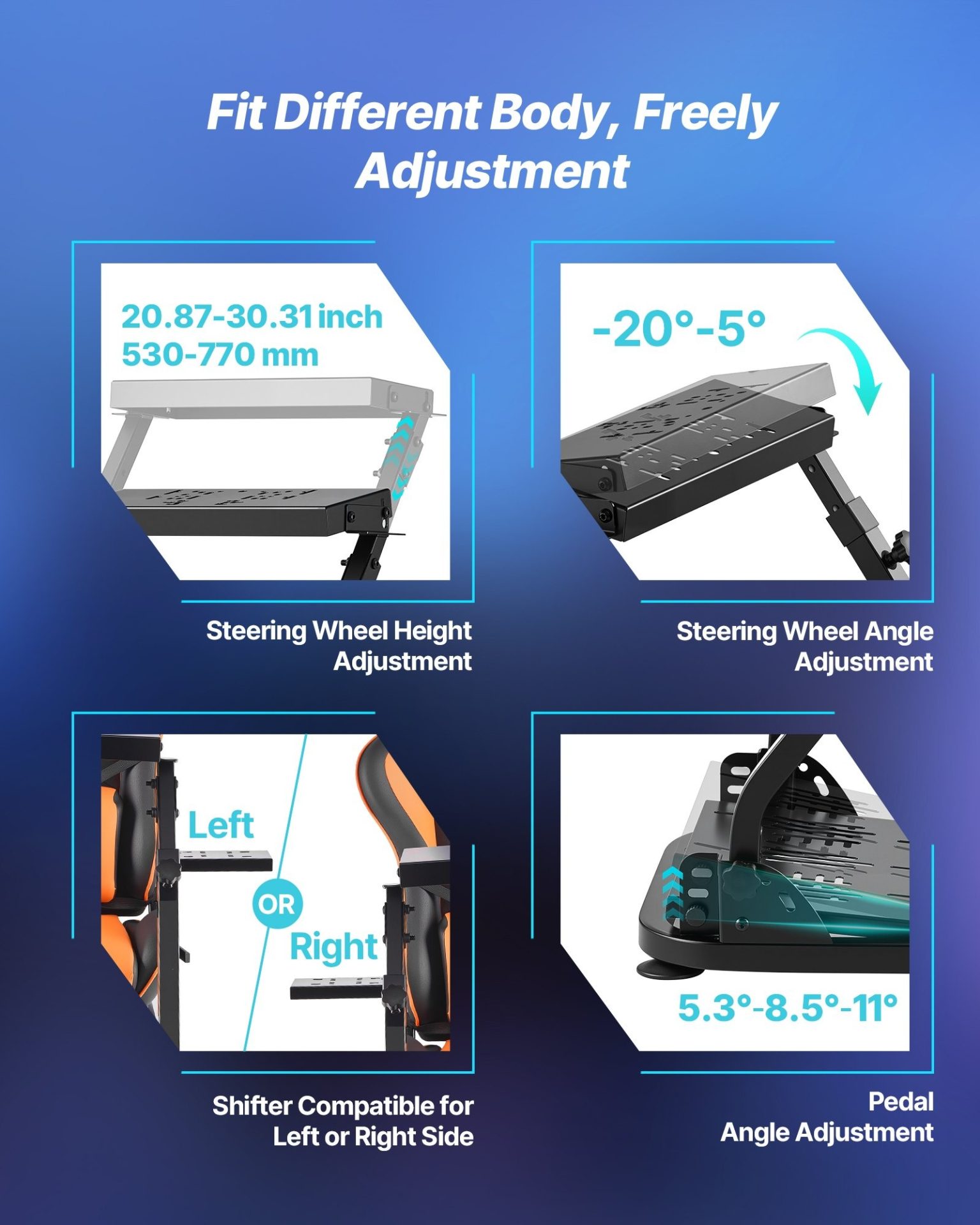 Позицията на волана поддържа регулиране по височина и ъгъл. Платформата за педалите предлага три фиксирани позиции на наклон. Поставката за скоростен лост позволява монтаж от лява или дясна страна. Седалката разполага с механизъм за регулиране на наклона от 90° до 135° и надлъжно преместване до 160 мм, което позволява адаптация към различен ръст и предпочитана позиция на управление.