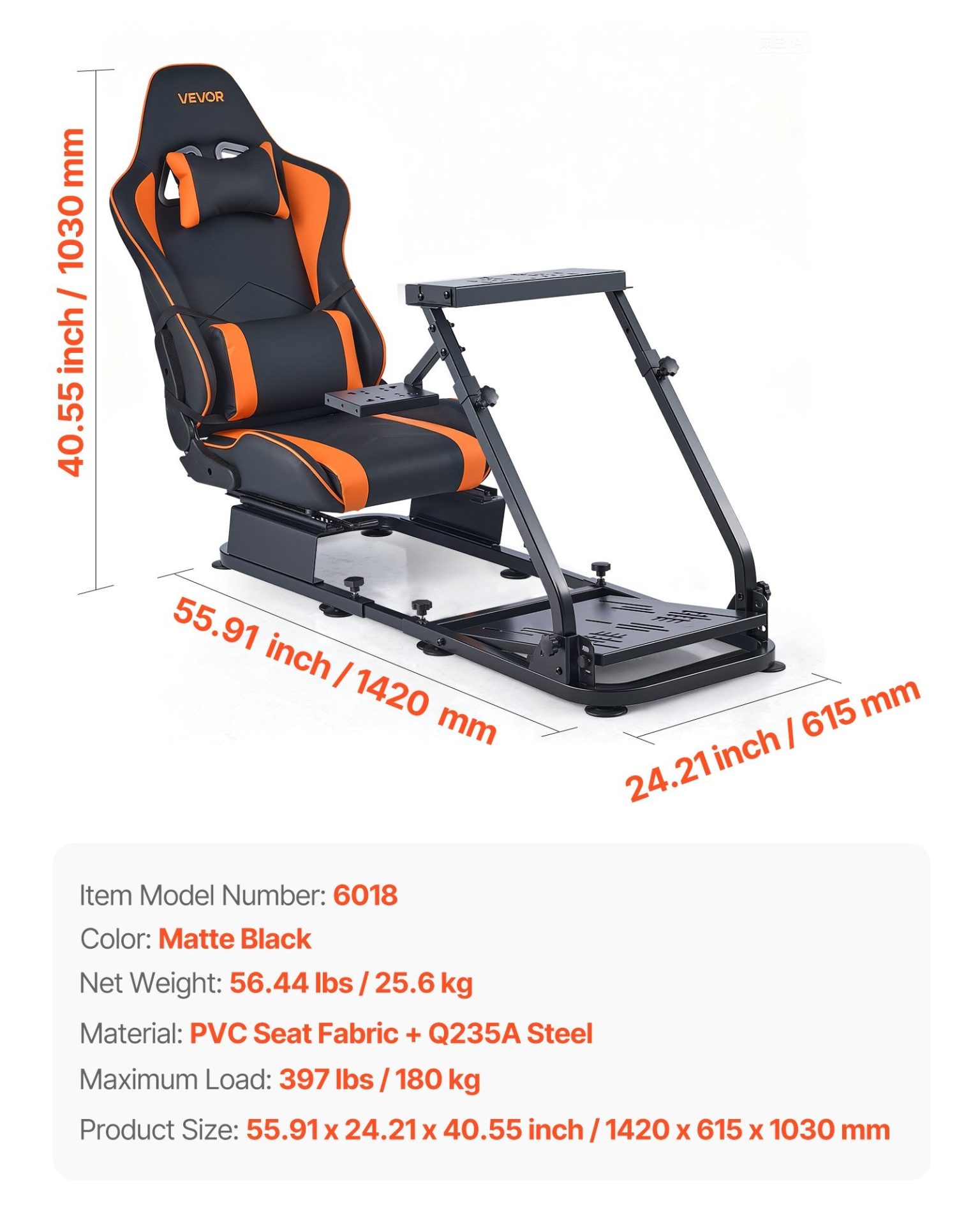 Стойката за волан и педали VEVOR е предназначена за изграждане на стабилен racing симулатор с волан, педали и скоростен лост. Конструкцията включва масивна стоманена рамка и отделна спортна седалка, свързани в единна система за реалистично управление при симулационни игри. Рамката е изработена от конструкционна стомана Q235A с подсилени заварки и усилени монтажни точки. Допустимото натоварване достига до 180 кг, което осигурява стабилност при силен force feedback, интензивно натискане на педалите и продължителни сесии.