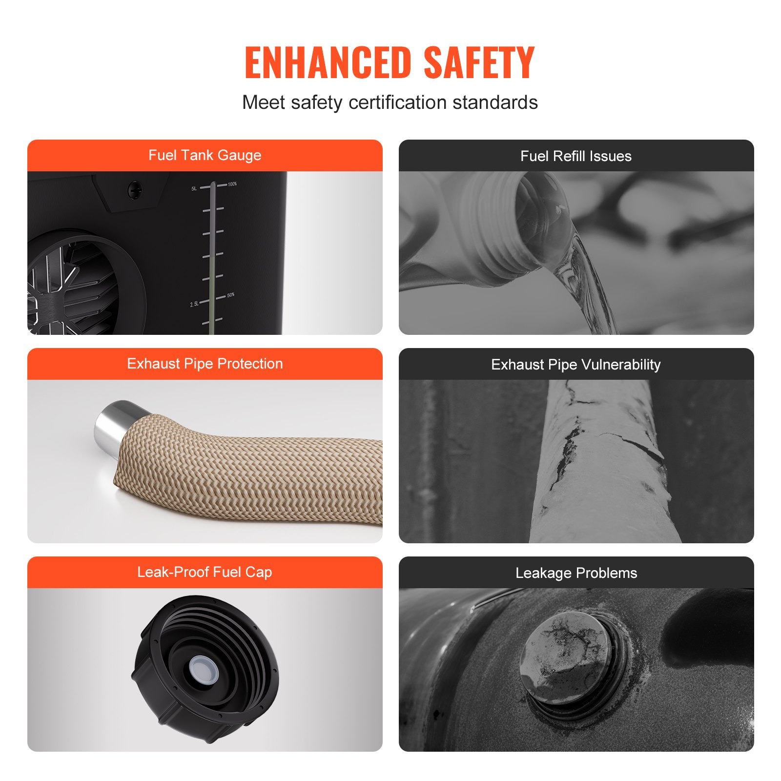 Съвременните модели на VEVOR са оборудвани със защити за безопасна експлоатация. Вградените системи за следене на въглероден оксид и защита от прегряване реагират при отклонения и осигуряват спокойна работа. Правилното отвеждане на изгорелите газове извън обитаемото пространство елиминира риска от миризма и гарантира чист въздух.