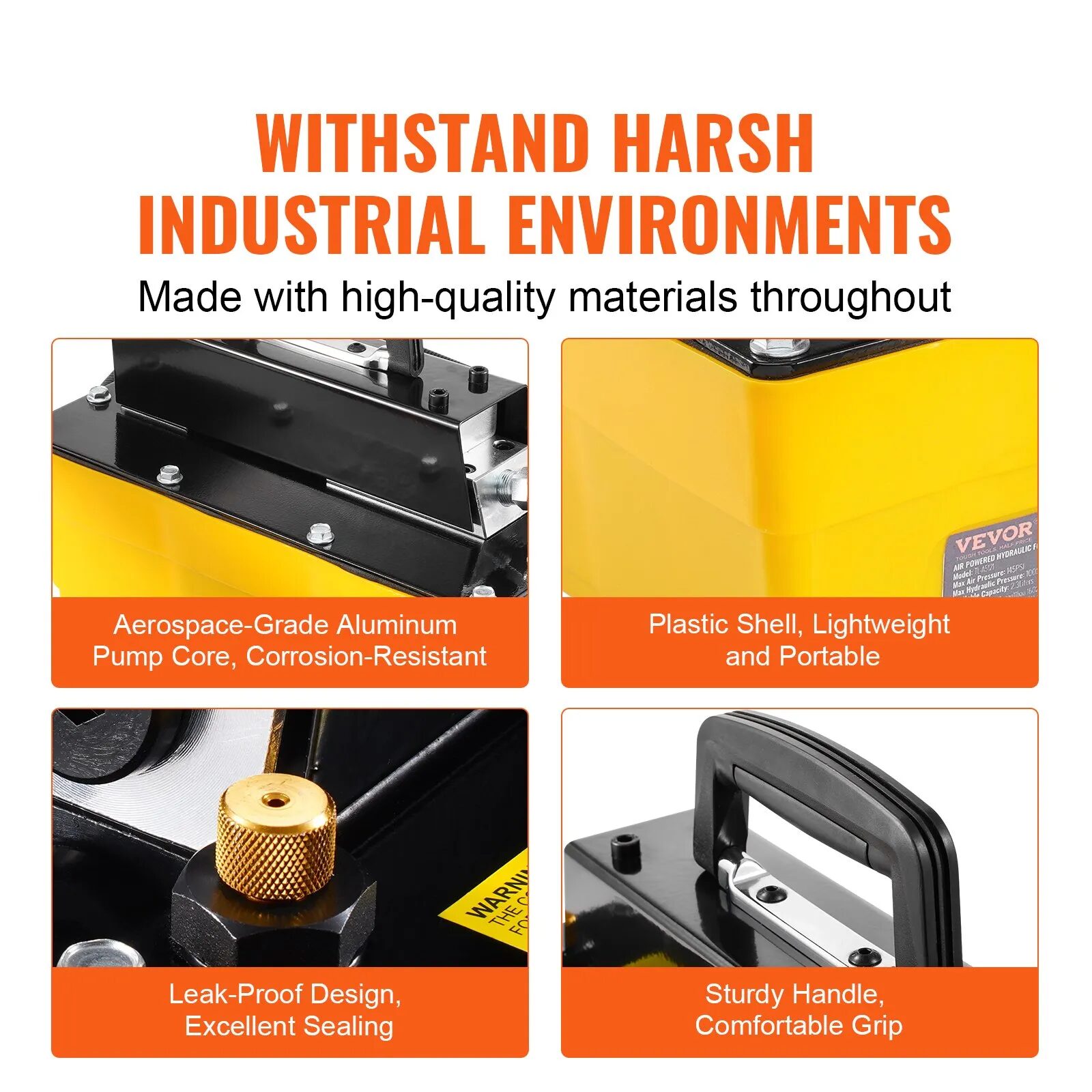 Въздушната хидравлична помпа Vevor TL-A5121 е проектирана за тежки индустриални натоварвания и професионални приложения. Тя е с налягане до 689 bar (10 000 PSI) и въздушен дебит 340 литра в минута. Уредът осигурява мощност и ефективност, подходящи за повдигане, пресоване, огъване, рязане, сглобяване и разглобяване на метални конструкции или автомобилни рамки.